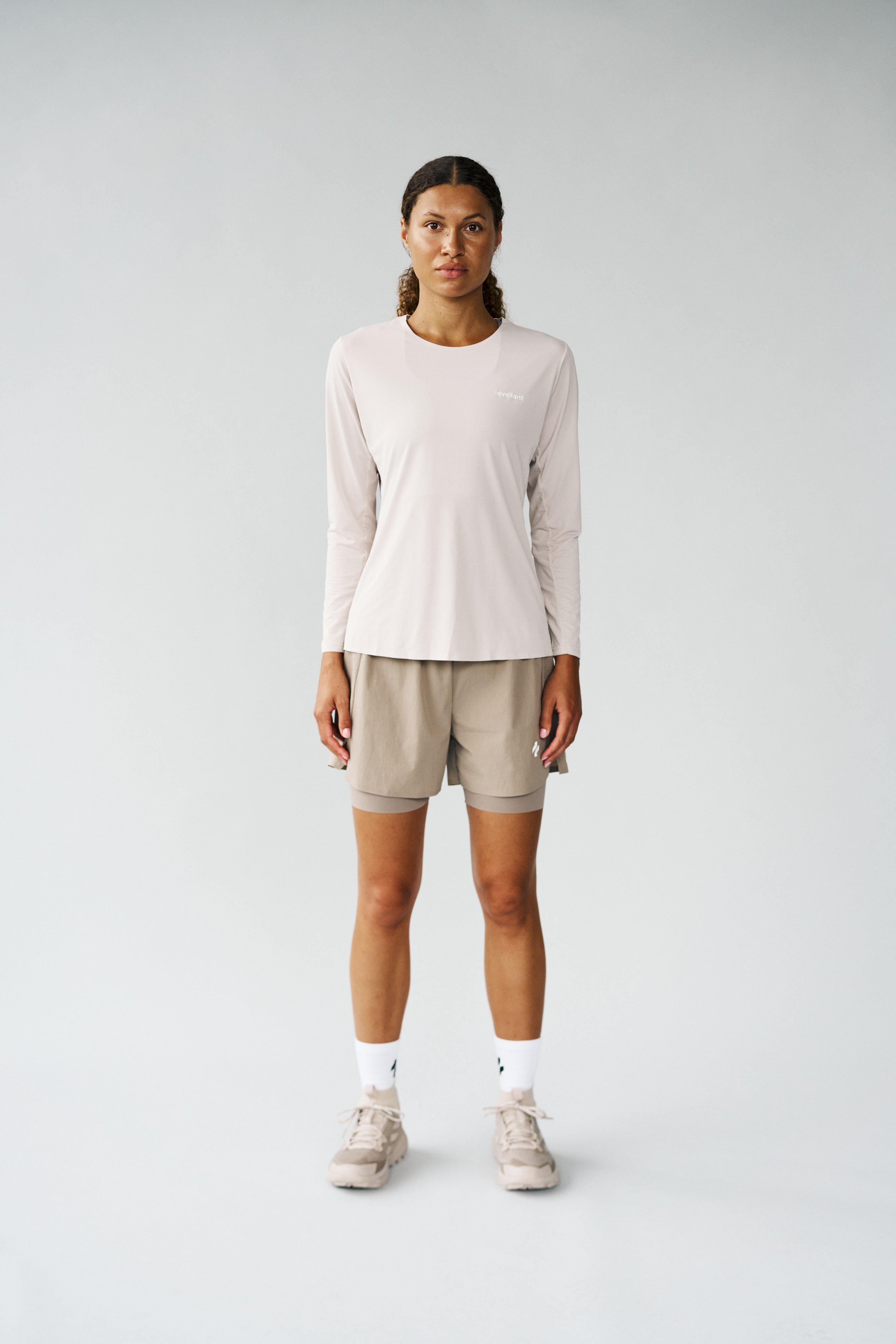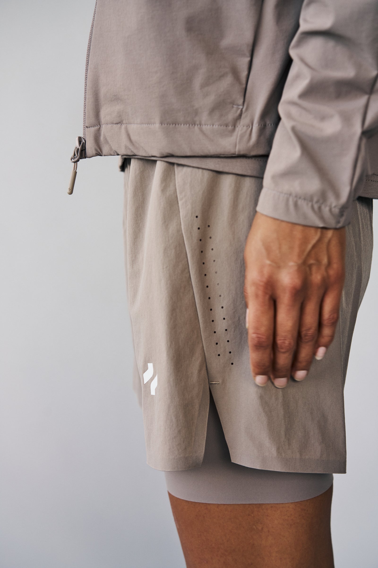 Women’s Arc Dual is reduced to two layers: a light outer short and an integrated Aerra™ inner. The outer is a 135 GSM stretch woven - cut for movement, ventilated with laser perforation, and finished with a split hem. Beneath, Aerra™ provides structure: a matte knit with sculpting hold, brushed softness and quiet stretch. A bonded rear pocket refines utility, leaving the silhouette clean and uninterrupted. Engineered for long form movement - equally suited to trail, track or daily rhythm.